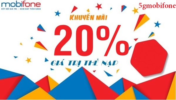– Khuyến mãi tặng 20% giá trị thẻ nạp vào tài khoản khuyến mãi không giới hạn mệnh giá hay số lần nạp tiền. Qúy khách chỉ cần nạp thẻ, Mobifone sẽ cộng tiền theo mệnh giá.